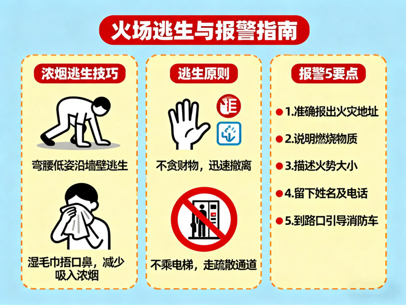 1. 浓烟逃生:弯腰贴地+湿毛巾捂口鼻,避开浓烟区