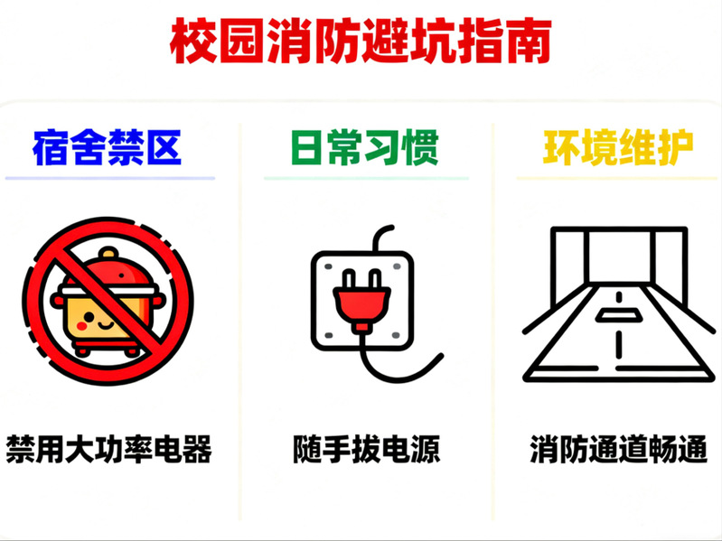 1.宿舍禁区:禁用大功率违规电器(热得快、电煮锅等),插排不串联、不超负荷