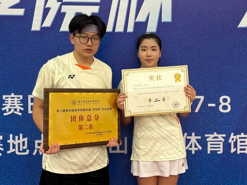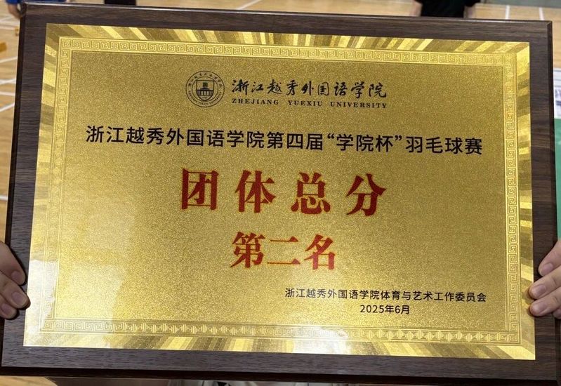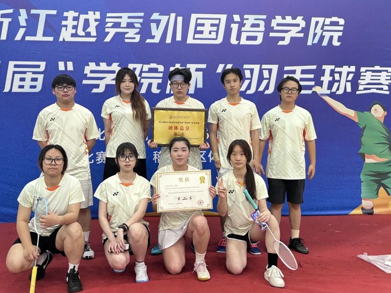 应用外语学院荣耀时刻——金琼钰、金航、陈李金、朱欣冉、陆稼烨、胡桐、胡贶、何治、郑雅文、王浩十位骁将,以凌厉之姿斩获浙江越秀外国语学院第四届“学院杯”羽毛球赛团体亚军!