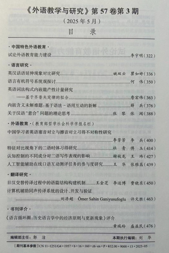 2025年5月,我校应用外语学院王金芝老师以第一作者身份在权威期刊《外语教学与研究》2025年第3期发表了题为《日汉交替传译过程中的语篇结构构建机制》的研究论文。