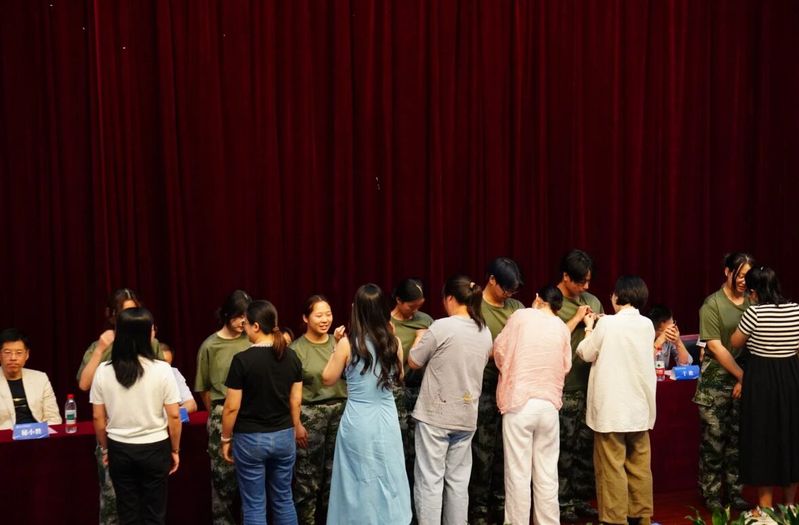 发言结束,各班班主任和新生代表齐上台,由班主任为同学们佩戴校徽并合影,愿此刻佩戴校徽的新生们,以越秀学子的身份砥砺前行,既怀少年意气,亦担时代重任。