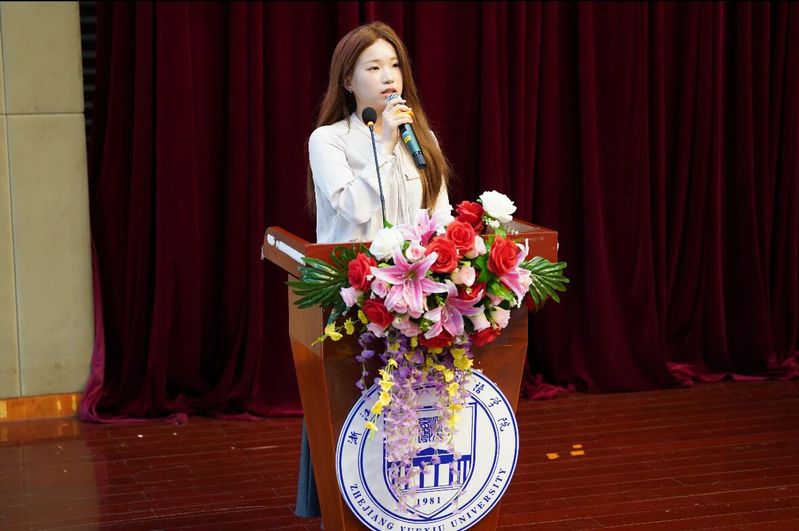 应用英语系学生董安琪同学作为老生代表发言。她分享了自己的学习经验、积极参与学校的各种活动比赛以及暑期前往马来西亚学习的经历,鼓励同学们通过自己的努力成为优秀的外语学习人才。