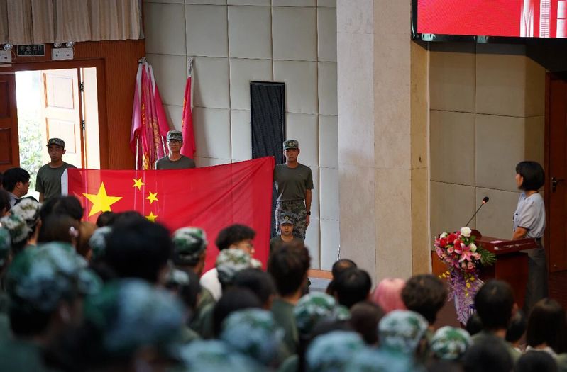 在庄严的国歌中,教官队带着国旗走来,同学们全体起立,肃然起敬面向国旗唱国歌,展现了应外学子良好的精神风貌。