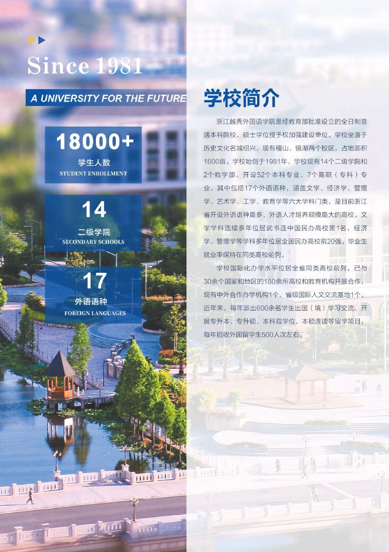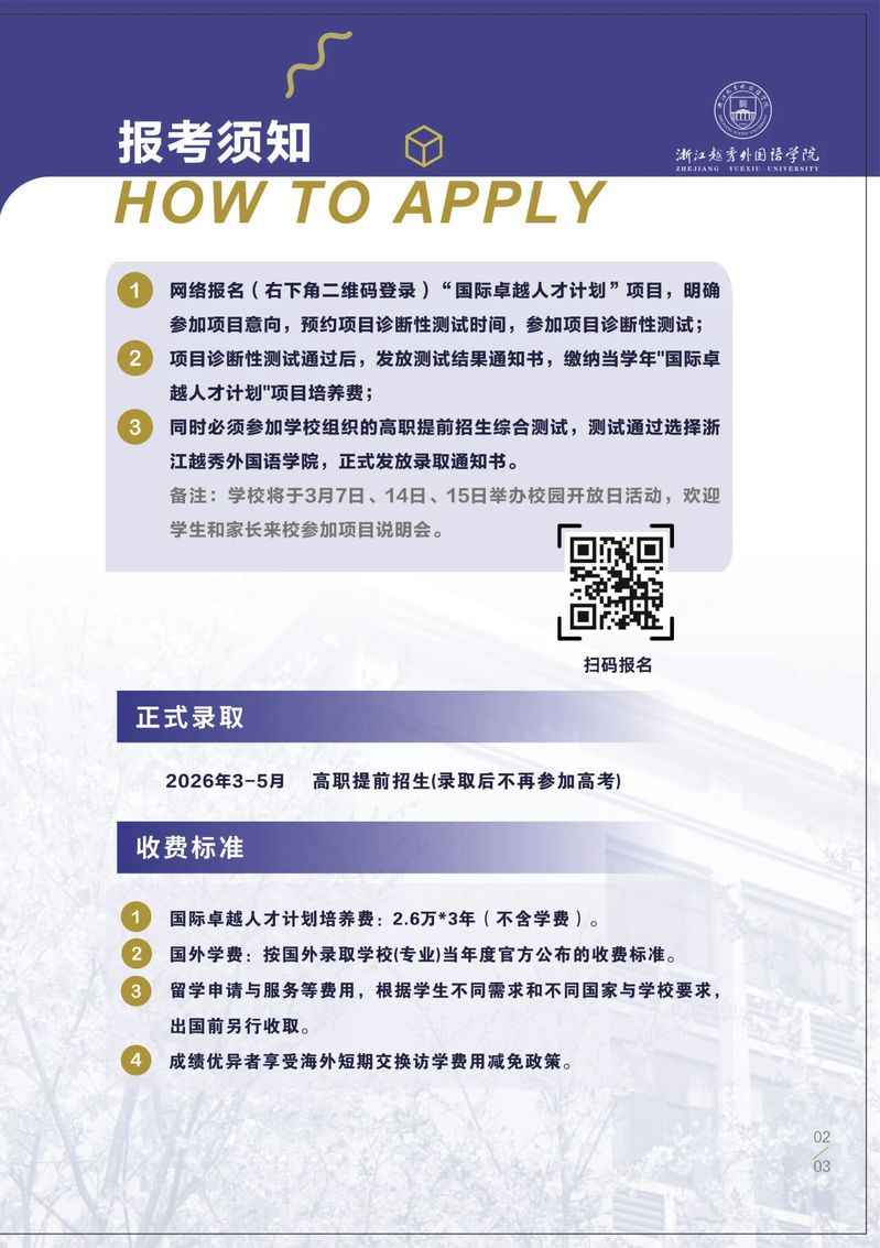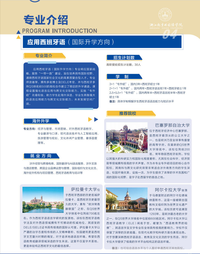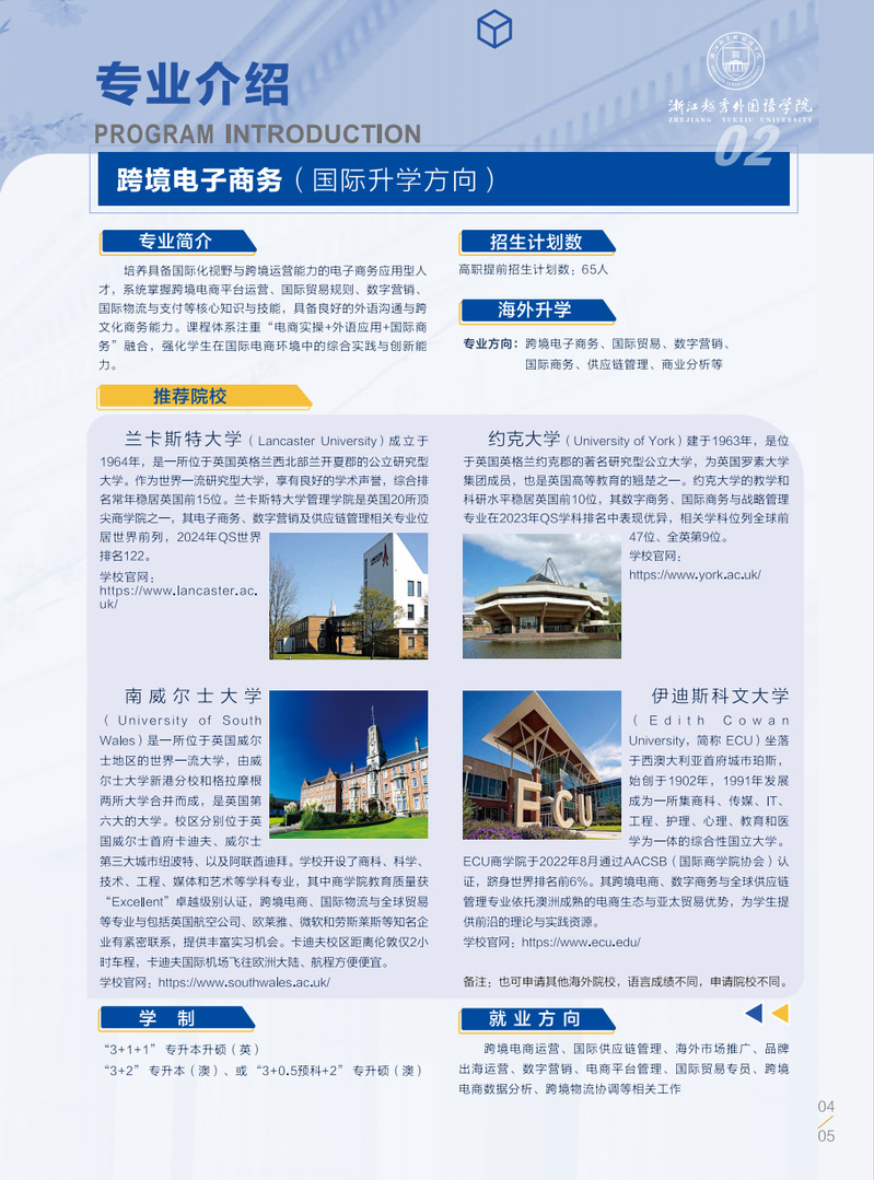 浙江越秀外国语学院致力于培养具有家国情怀、创新素养、开阔视野和涉外胜任力,适应人工智能时代需求的应用型、融通型、国际化高级专门人才,与多所海外名校合作开展专升本、专升硕定向培养。